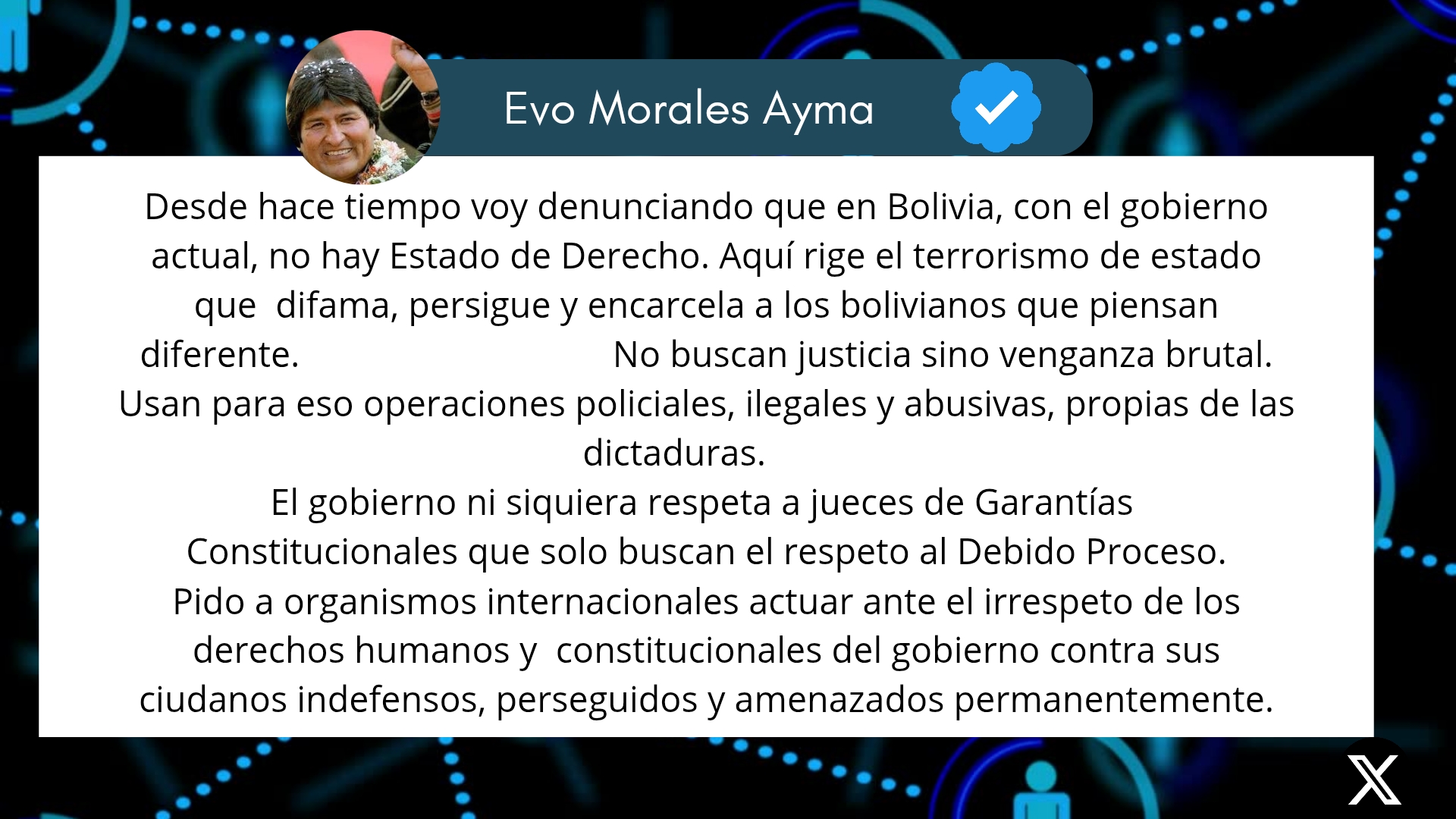 «Desde hace tiempo voy denunciando que en Bolivia, con el gobierno actual, no hay Estado de Derecho. Aquí rige el terrorismo de estado que difama, persigue y encarcela a los bolivianos que piensan diferente. No buscan justicia sino venganza brutal. Usan para eso operaciones policiales, ilegales y abusivas, propias de las dictaduras.