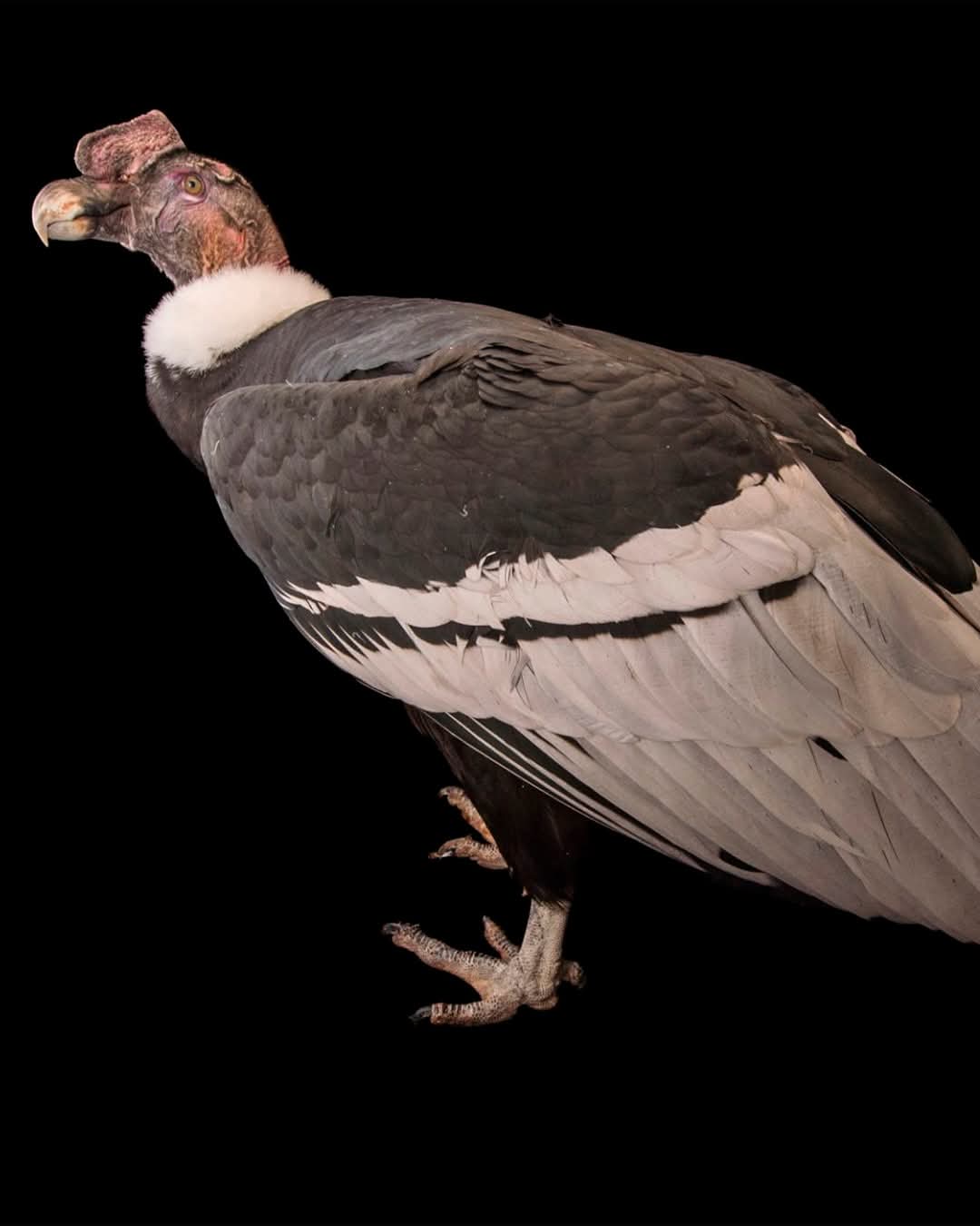 Caracterizado por su bufanda de plumas blancas alrededor del cuello y al final de sus alas, este animal es muy reconocible también por carecer de plumas sobre su cabeza rojiza, al igual que sus parientes los cóndores californianos, y puede cambiar de color según el estado emocional del ave. Suelen vivir en zonas montañosas, pero también cerca de las costas, donde abundan las brisas marinas, e incluso en desiertos con fuertes corrientes térmicas de aire.