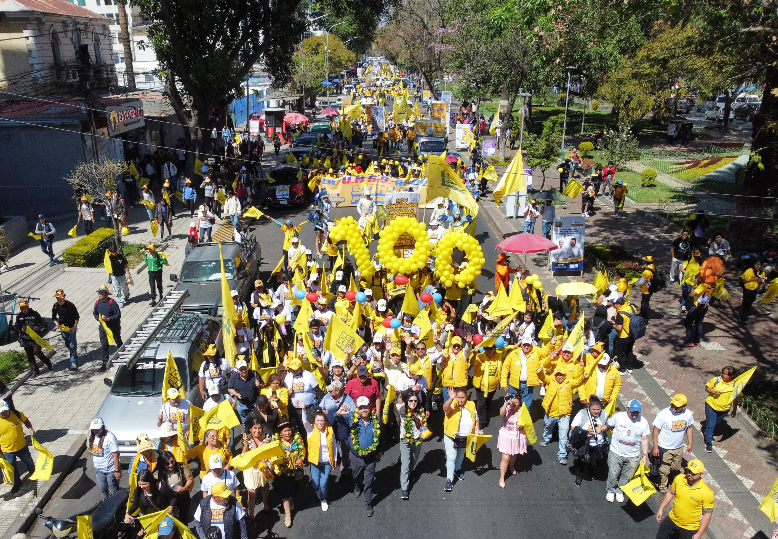 El cierre de campaña estuvo adornado por globos amarillos que formaban el número 100 en alusión al plan de Samuel Doria Medina de resolver la crisis en ese periodo de tiempo.