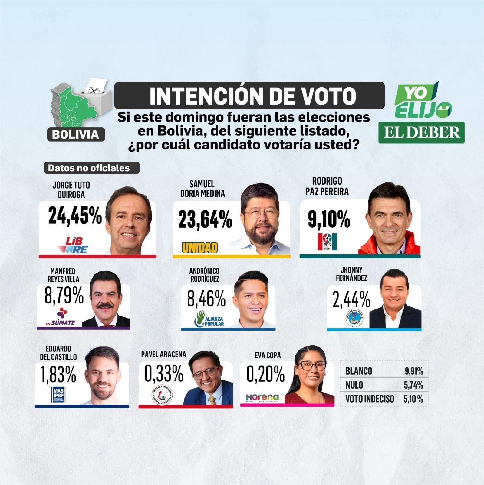 En el segundo bloque, Rodrigo Paz consolida el tercer puesto con 9,10%, seguido de Manfred Reyes Villa (8,79%) y Andrónico Rodríguez (8,46%). Más atrás: Jhonny Fernández (2,44%), Eduardo Del Castillo (1,83%), Pavel Aracena (0,33%) y Eva Copa (0,20%). El voto no definido alcanza el 20,75% (blancos 9,91%, nulos 5,74% e indecisos 5,10%).