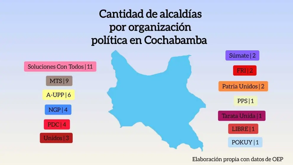Cochabamba, 31 de Marzo de 2026.- Soluciones Con Todos, Movimiento Tercer Sistema (MTS) y Alianza Unidos Por los Pueblos (A-UPP) tienen más de la mitad de las alcaldías del departamento de Cochabamba.