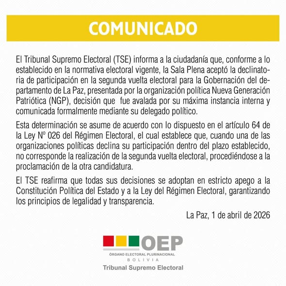 La Paz, 1 de Abril de 2026.- El Tribunal Supremo Electoral aceptó la declinatoria de participación en la segunda vuelta electoral para la Gobernación del departamento de La Paz, presentada por la organización política Nueva Generación Patriótica (NGP).