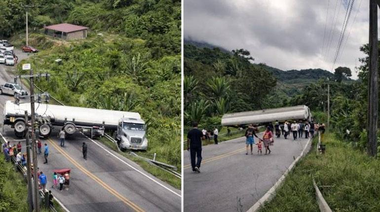 Cochabamba, 3 de Abril de 2026.- Un camión cisterna se salió de la vía y volcó este viernes en la carretera Cochabamba-Santa Cruz, a la altura del cruce a Incachaca, provocando la interrupción total del tránsito vehicular.