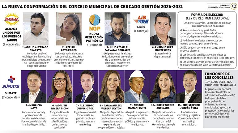 De los 11 concejales que la normativa permite elegir, según la población de Cercado, siete pertenecen a la agrupación política Autonomía para Bolivia (APB) Súmate, del alcalde Manfred Reyes Villa. (ver infografía).
