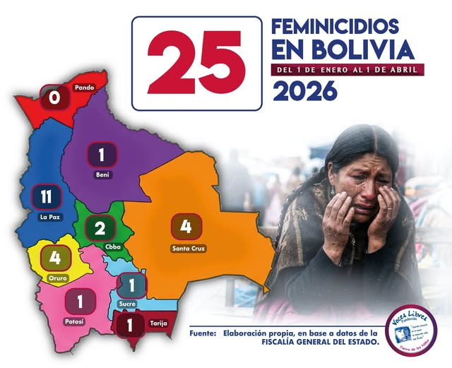 País, 6 de Abril de 2026.- Los feminicidios en Bolivia aumentaron un 13% en 2026, en comparación con el mismo periodo de 2025, de acuerdo al registro del Observatorio de Justicia de la Fundación Voces Libres, con base en los datos oficiales de la Fiscalía General del Estado. Oruro y La Paz son los departamentos que más casos han registrado y es urgente que las autoridades encargadas de la prevención identifiquen qué factores influyen en ambos para este aumento.