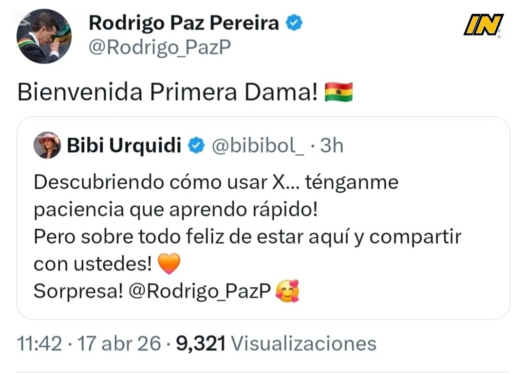 Cochabamba, 17 de Abril del 2026.- El presidente Rodrigo Paz, saludó el ingreso de la primera dama a la red social X:
