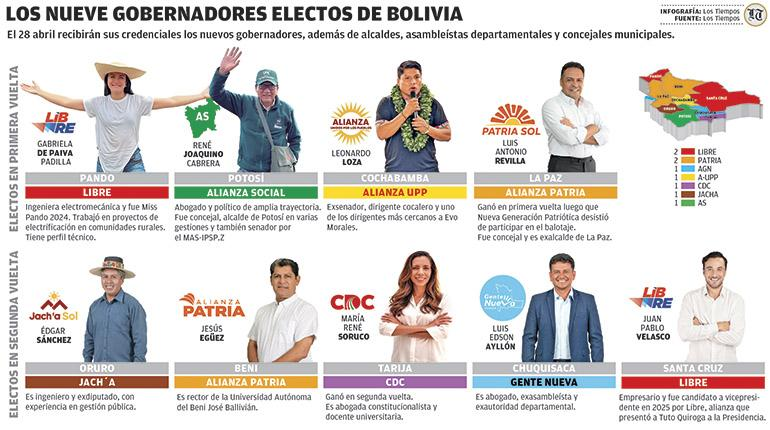 En tanto, ya desde la primera vuelta del 22 de marzo, se ha destacado la figura de la gobernadora electa de Pando, Gabriela de Paiva, y tras el balotaje ocupan la arena política Juan Pablo Velasco, como gobernador de Santa Cruz, María René Soruco en Tarija y Edgar Sánchez en Oruro.